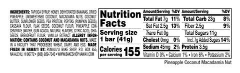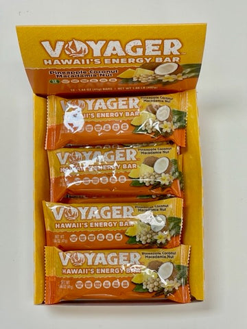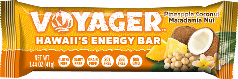 Voyager Hawaii's "New" Energy Bar - Pineapple Coconut Macadamia Nut - Gluten free, dairy free, grain free, soy free, egg free, non GMO. Carried in the canoes of ancient Polynesians, Ulu (breadfruit), Niu (coconut), and Mai'a (banana) were life sustaining cargo.  These bars feature these vital foods, along with other nutritious ingredients, to offer a delicious energy-packed treat to naturally power your daily voyages, wherever they may take you.  Each box contains 12 / 41 gram bars.