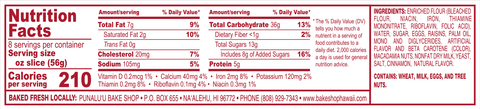 Macadamia nuts are grown here on the Big Island and adds a buttery-rich flavor to our bread, complimented by savory cinnamon and sweet raisins. There’s a reason we ship this bread in packages of six loaves…once you’ve tried it, you’ll be glad that you have that many. Includes six 16-oz loaves.